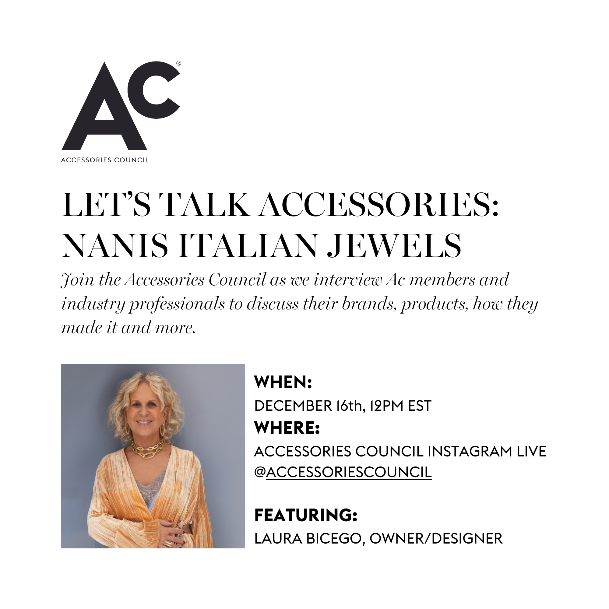 Tune in on Instagram @accessoriescouncil to meet Ac member Laura Bicego, Owner & Designer of NANIS Italian Jewels.