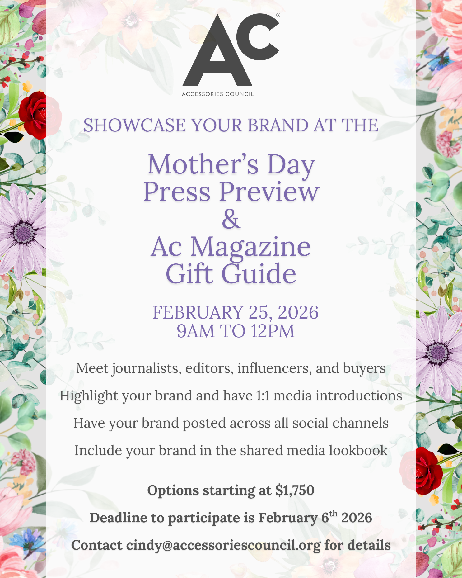 The Accessories Council (Ac) is a leading not-for-profit trade association founded in 1994 to represent the vibrant and ever-evolving fashion accessories industry. Our members include brands, designers, and retailers across jewelry, handbags, footwear, eyewear, and lifestyle accessories, showcasing the creativity and craftsmanship that define the category. Our mission is to elevate global awareness and demand for fashion accessory products, connecting and empowering businesses through advocacy, education, and visibility. Today, the Ac is recognized as a trusted voice and resource within the U.S. fashion market, representing an industry that generates over $137 billion annually (source: Circana).